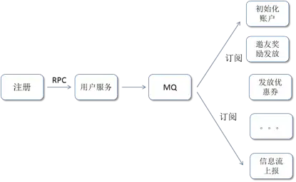 1、上游不关心下游执行结果,例如上述案例中用户注册后,我们并不关心账户是否初始化,是否上报了信息流等;