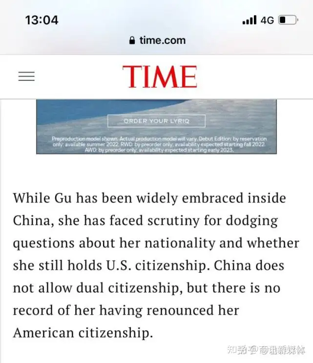 翻译出来是:尽管谷在中国国内广受欢迎,但她因回避有关其国籍和是否仍持有美国公民身份的问题而面临审查。中国不允许双重国籍,但是没有她放弃她美国公民身份的记录。