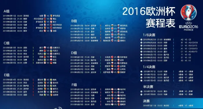 现在完整版欧洲杯赛程图已经出炉,如下: