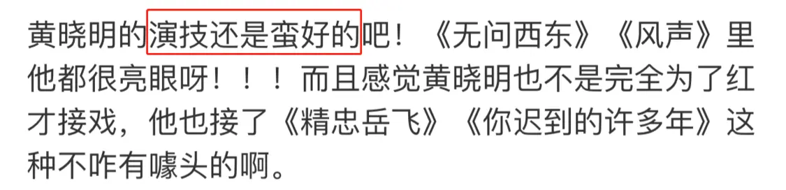 不过也有人表示反对,称黄晓明的演技还是非常撑得起剧,《风声》、《无问西东》中,他的表现都非常亮眼。黄晓明接戏也不并是为了红,毕竟他也拍了许多其他剧。