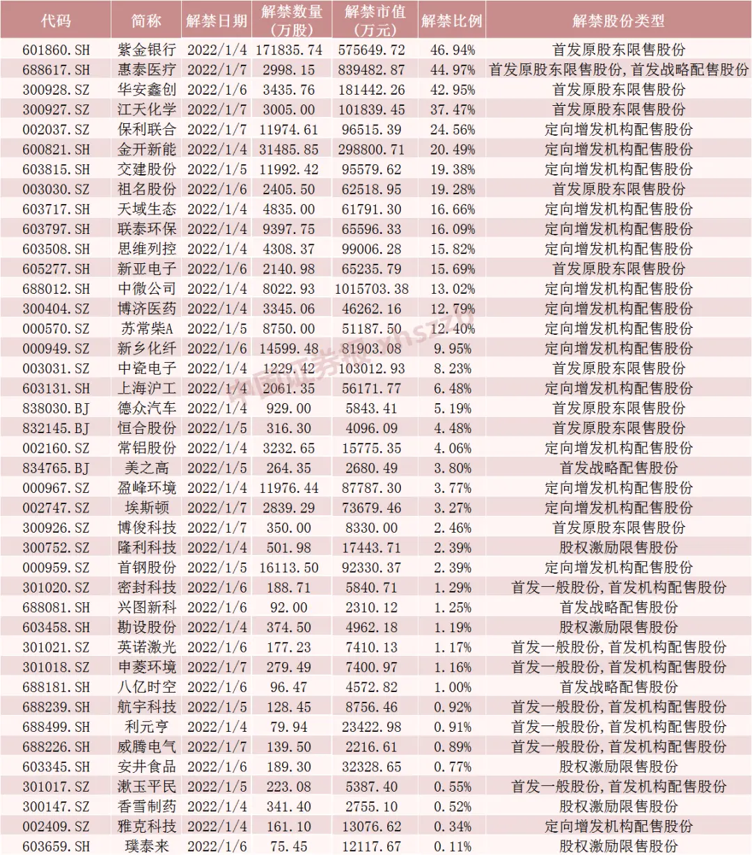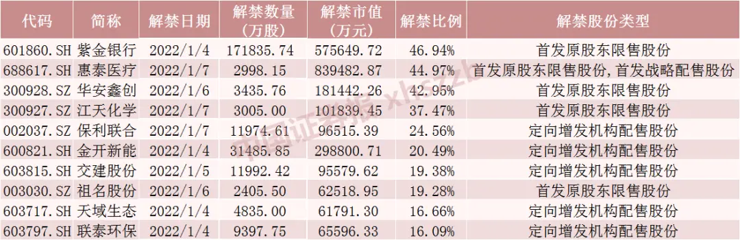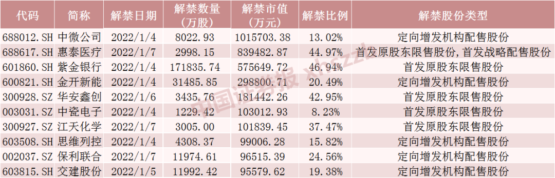 Wind数据显示,中微公司1月4日将解禁8022.93万股,均为定向增发机构配售股份。惠泰医疗1月7日将解禁2998.15万股,为首发原股东限售股份和首发战略配售股份。紫金银行1月4日将解禁17.18亿股,均为首发原股东限售股份。