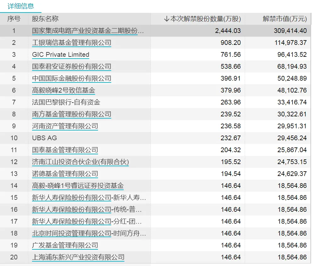 中微公司解禁详细信息