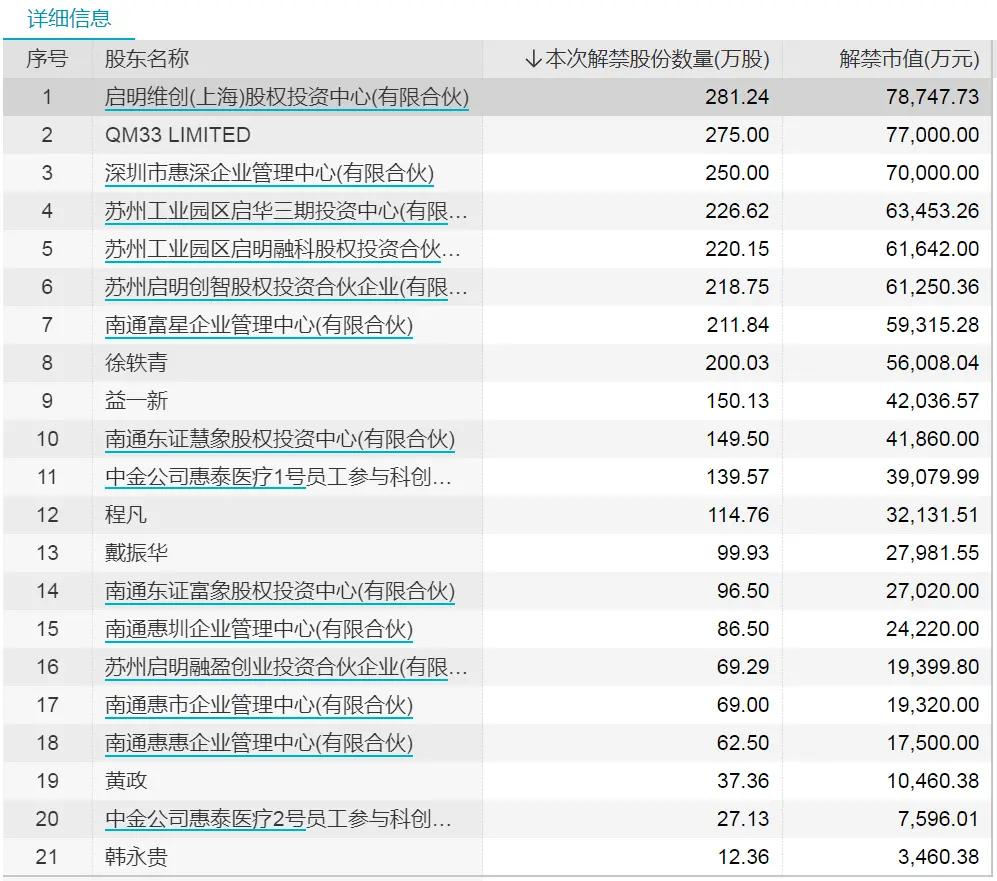 惠泰医疗解禁的股份来自于启明维创(上海)股权投资中心(有限合伙)、QM33 LIMITED等21个股东,其中有8个股东分列惠泰医疗第三至第十大股东,所持股份均将在1月7日迎来解禁。而在惠泰医疗解禁股中,有166.79万股为战略配售股份。