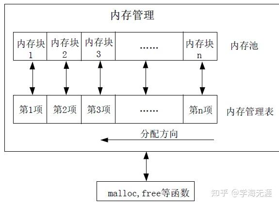 注意表中的分配方向,从顶到底。每一项对应一个内存块。里面的数值代表了内存池的状态:如果为0,表示该内存没有被分配;如果非0,那么数值的大小就表示了该块内存被连续占用的内存数。比如说数值为20,意思是包括该项在内的内存块被连续占用了20块分给了指针。