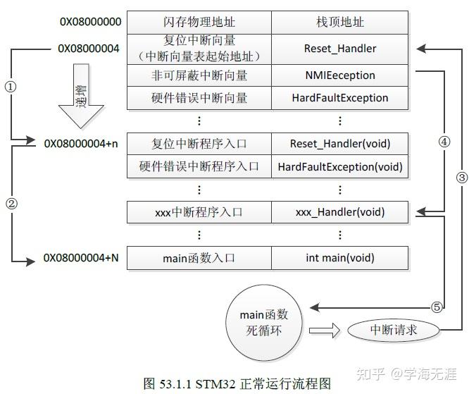 上图表示STM32正常运行的流程图,可以看到上电复位后系统从0x80000004处开始运行程序,这里放置的是复位中断向量,然后跳转至复位中断程序入口后再跳转至main函数运行用户的程序。