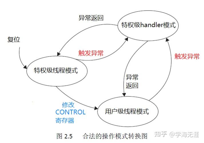 处理器也有两种特权分级:特权级和用户级。 这张图说明了一切:复位进入特权级线程模式,如果有异常,进入特权级的handler模式处理异常或中断例程,然后返回至特权级线程模式。通过修改CONTROL寄存器可以进入用户级线程模式。