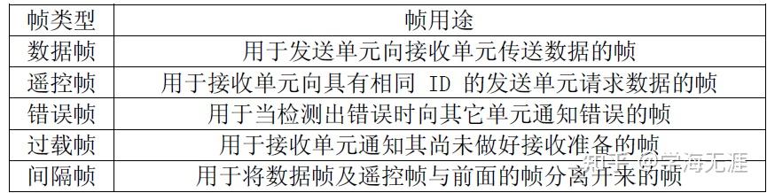 112、 CAN协议的有5种类型的帧:数据帧、遥控帧、错误帧、过载帧、帧间隔。其中前两种帧有标准格式(11位ID)和扩展格式(29位ID)。