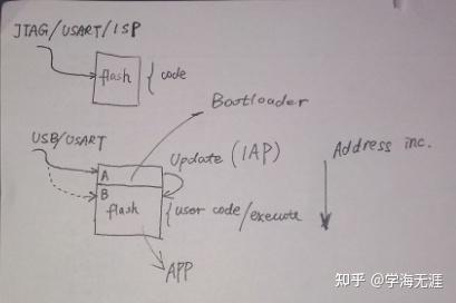在普通编程中,flash中的code是通过JTAG和ISP等工具下载到单片机中。而在IAP编程中,flash被分区为A和B两个区域,A区域只允许用USB/USART等方式下载,此区域作为更新B区域的代码用。B区域则是用户的code区域,真正的代码在这里被执行,放置的就是app。