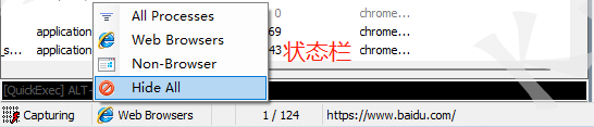 当我们需要对某个网站进行抓包时,只需要打开Fiddler工具,观察状态栏中的Capturing是否存在,存在则代表正在记录会话。选择All Processes捕获所有进程会话。打开网站后,Fiddler会自动的记录每条会话信息,会话列表中记录了Fiddler抓到的每条请求数据包,包含: