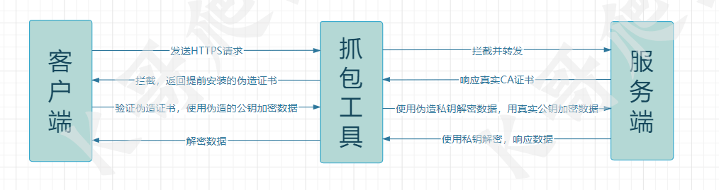 以Fiddler为例,此类抓包工具通过代理某个端口,拦截经过该端口的通信协议,并对传输数据进行解析展示,使用也起来非常简单。对于HTTP请求,数据传输都是明文,抓包工具可以直接看到数据报文。但HTTPS请求在HTTP基础上多了一层SSL/TLS协议,在数据传输中采用了双向加密,对于传输中的数据包需要密钥来进行解密,因此抓包工具即使拦截到了数据包,也无法对数据进行解析。因此Fiddler、Charles在使用前需要安装证书。