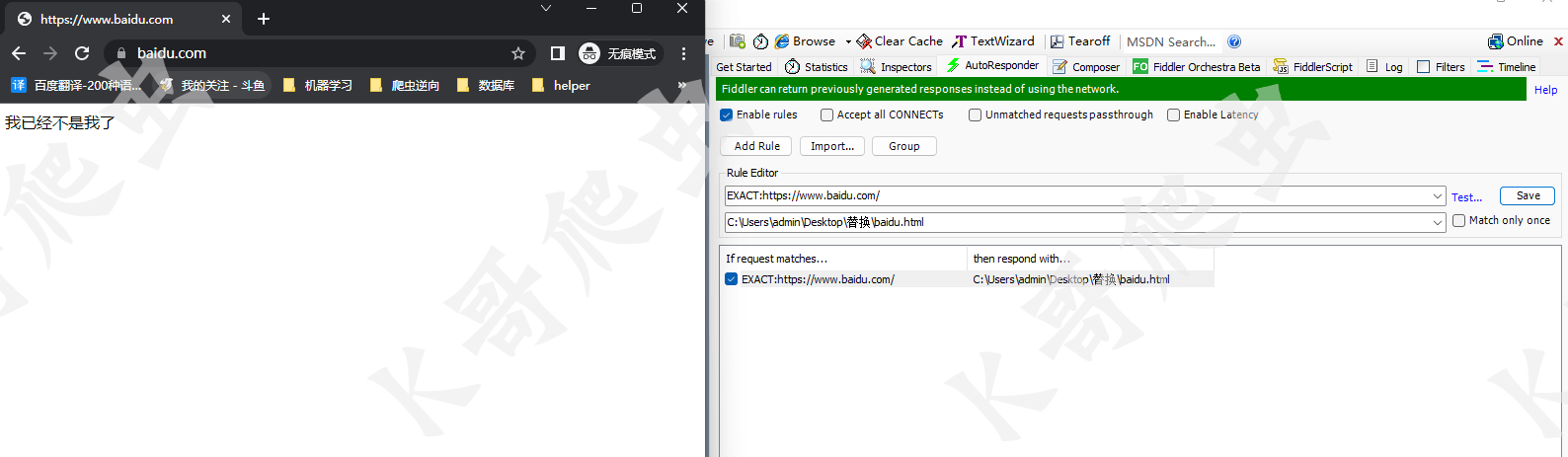将想要修改的请求拖入AutoResponder中 勾选Enable rules -> Add Rule 点击Rule Editor框的第二栏,滑倒最下,选择Find a file,选择进行替换的文件 Save 保存保存完成后刷新就可以发现目标请求被替换了。