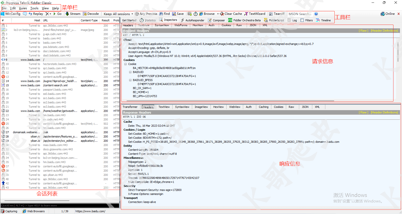 请求信息栏和响应信息栏中记录了请求和响应时的详细信息。