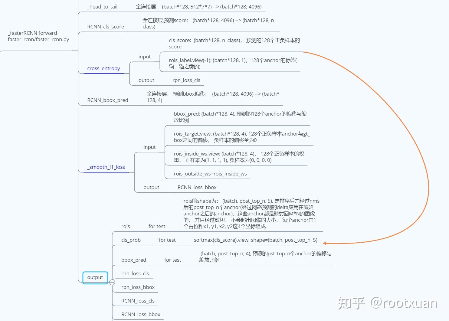 ii: RCNN_rpn, rpn网络, 计算rios、前景背景2分类loss和粗边框回归loss, 其中rois的shape=(batch, post_top_n, 5), 是排序后并经过nms后的post_top_n个anchor(经过网络预测的delta修正原始anchor之后的anchor),这些anchor都是映射回MxN的图像的, 并且经过剪切, 不会超出图像的大小, 每个anchor由1个占位和x1, y1, x2, y2这4个坐标组成。