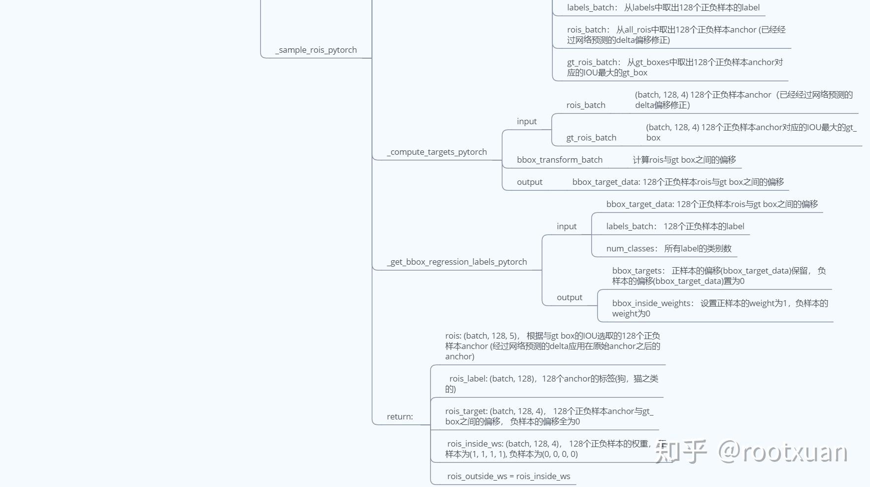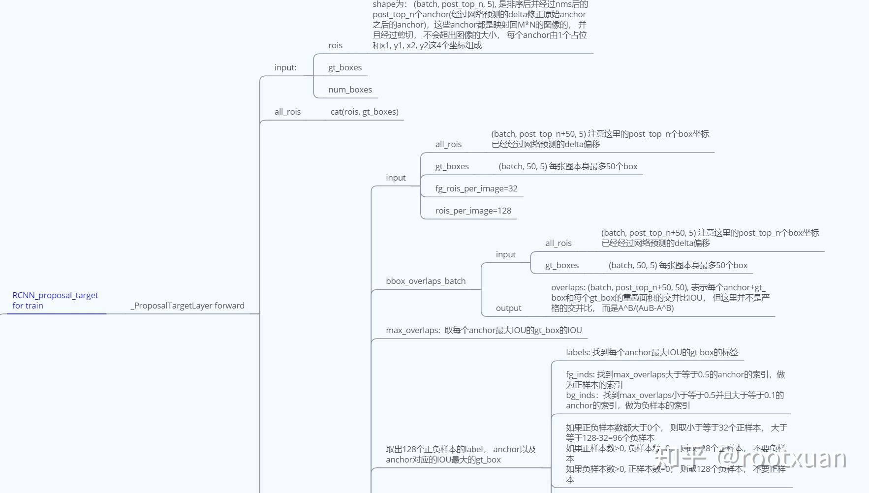 iii: RCNN_proposal_target, 本过程只有训练阶段有, 目的是得到128个与anchor有最大IOU的gt_box的label, 以及gt_box与anchor之间的偏移, 用作求类别loss和精边框回归loss.