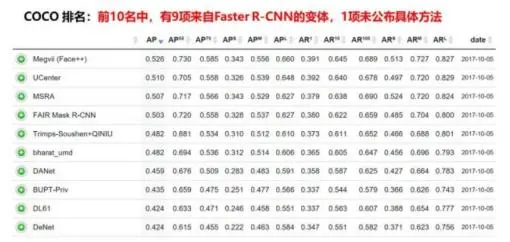 COCO数据集上,前 10 名中有 9 项都是来自于Faster R-CNN 的变体。