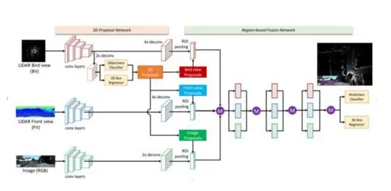 利用这个特点,我们可以做很多启发性的探索,前面提到,多传感器融合来构建自动驾驶的感知层是行业共识,如激光雷达在自动驾驶中是个很核心的传感器,有没有将激光雷达和视觉同时融合到一个网络中的方案呢?有人提出这样的方案,如下: