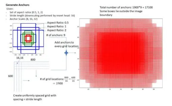 这种人为定义的框的结构更能精准的标定物体,当然,任何优势都是有代价的。Faster RCNN为每一个点都配备这9种anchors作为初始的检测框,所以在原始图上,anchors的个数特别多,然后让cnn来判断哪些是有目标的前景,哪些是没有目标的背景,然后再对目标anchors进行排序和NMS(非最大值抑制),即能得到最好的效果。能量是守恒的,当获得优势A时,并将付出B的代价,关键看代价是什么。feature map每个点设置9个Anchor,所以他的anchor是很多的,如下图所示(网络截图):