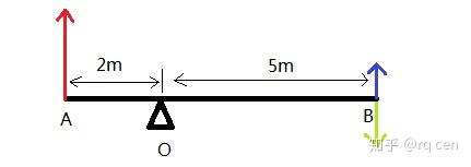 上图是个跷跷板,O是支点,杆AB可以绕着O自由旋转,假设杆AB没有质量。OA为2m,OB为5m。