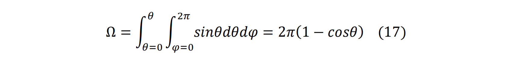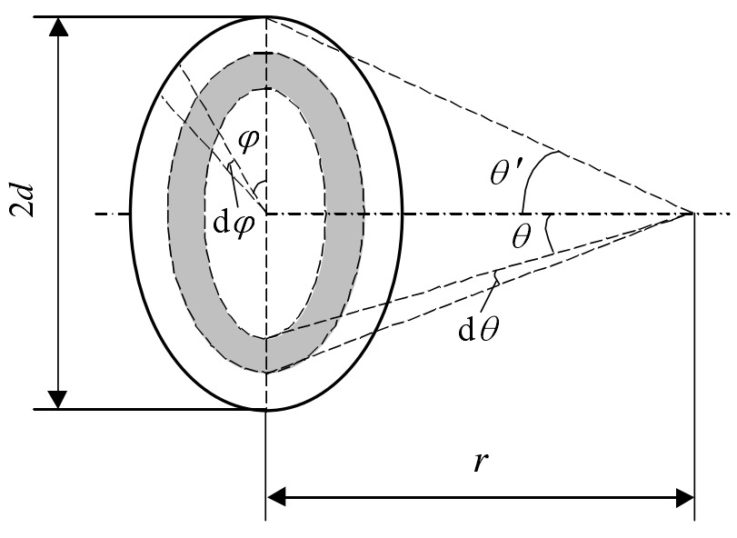 自目标辐射发射的红外辐射经过成像透镜之后汇聚后形成空间立体角为 \Omega 的光锥,如图12所示,其中 \theta 为半束角,则 \Omega 的表达式为: