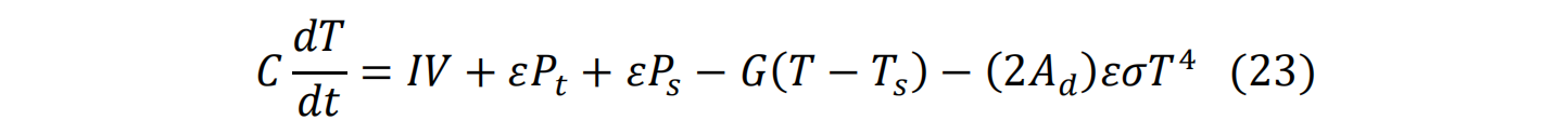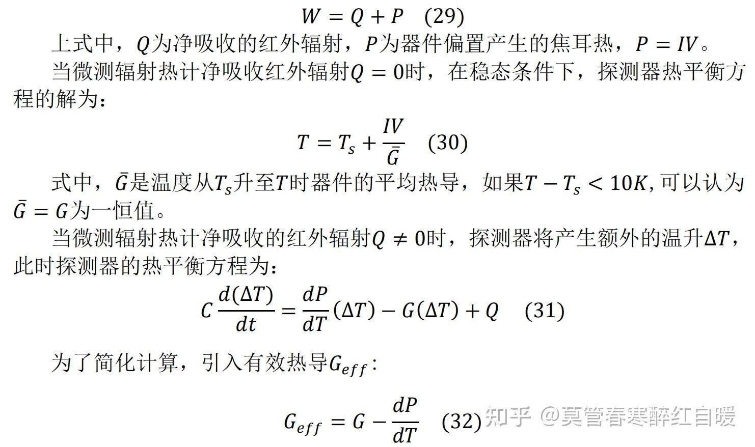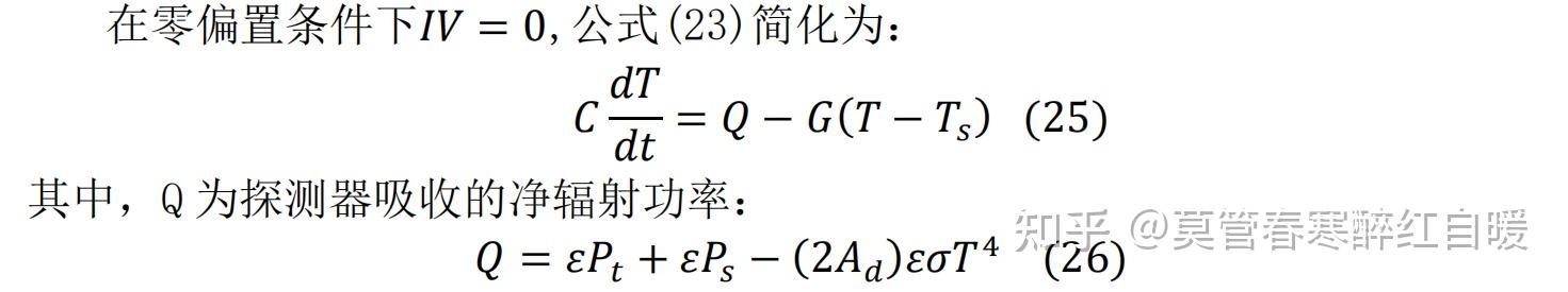 假定微测辐射热计的温度为 T 、发射率为 \varepsilon 、像元光敏面面积为 A_{d} 、探测器的偏置电压为 V 、偏置电流为 I 、热沉温度为 T_{s} 并满足 T-T_{s}\ll T_{s} ,则探测器温度变化所遵循的热平衡方程为: