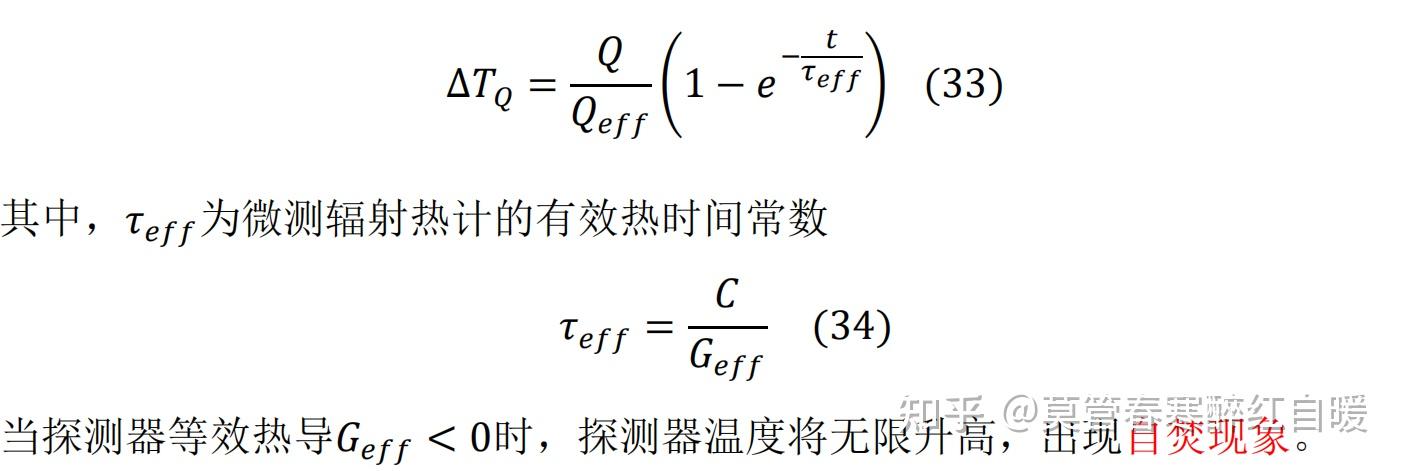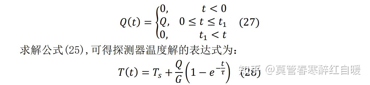 假定微测辐射热计净吸收的红外辐射功率为方波脉冲函数,在 t=0 时, Q(t):0\rightarrow Q 时,在偏置条件下,由红外辐射引起的探测器温升为: