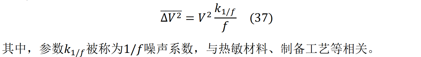 由于热敏薄膜导电的不连续性,测辐射热计热敏电阻通常会表现出某种程度的电阻扰动 \bar{\Delta R^{2}} 。当热敏电阻的偏置电流为 I 时,这一电阻扰动将产生与偏置相关的附加电压噪声 I\bar{\Delta \sqrt{R^{2}}} 。因为该电压噪声为探测器总噪声扣除Johnson噪声之后剩余的部分,所以这类噪声也被称为“过剩”噪声。过剩噪声分为两种形式,一种是1/f噪声,另外一种是电报噪声,电报噪声也称为爆米花噪声(一种随机噪声,与制造工艺相关)。