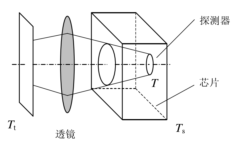 基于微测辐射热计的红外成像系统简化模型如图11所示。温度为 T_{t} 的目标黑体发出的红外辐射经过红外镜头之后,经过理想红外窗口入射到探测器的光敏面上,光敏面的温度为 T ,发射率为 \varepsilon ,硅衬底热沉与周围环境的温度为 T_{s} 。