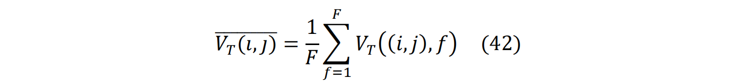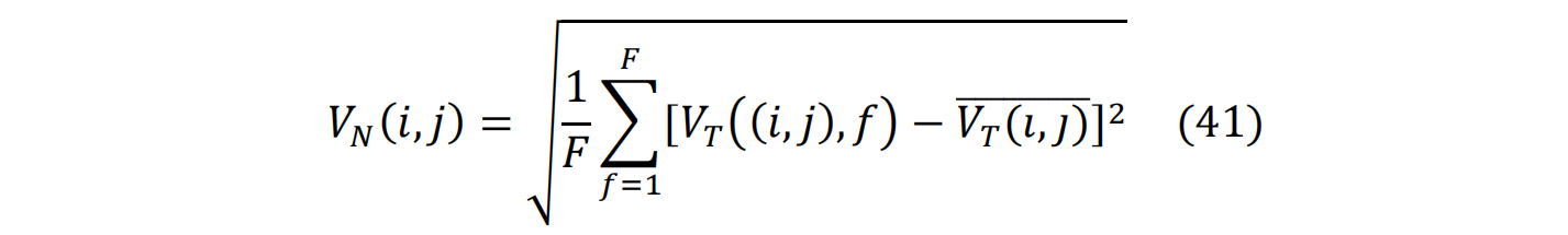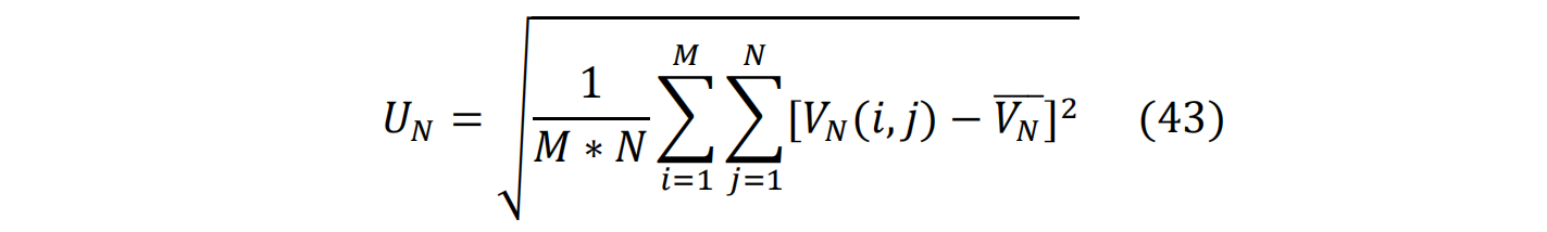 其中, F 为观察到的帧数,根据大数定理, F 越大,统计估算的RMS噪声 V_{N}(i,j) 越准确。 V_{T}[(i,j),f] 为第 f 帧第行第列像素的电压值, \bar{V_{T}(i,j)} 为该像素的时间均值: