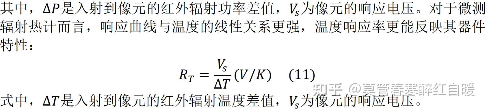 其中,是入射到像元的红外辐射功率差值,为像元的响应电压。对于微测辐射热计而言,响应曲线与温度的线性关系更强,温度响应率更能反映其器件特性: