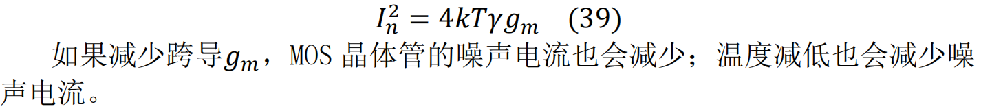 MOS晶体管最大的热噪声源是在沟道中产生的。对于工作在饱和区的长沟道MOS器件,一般用一个连接在漏源两端的电流源来模拟其沟道噪声,其噪声谱密度为: