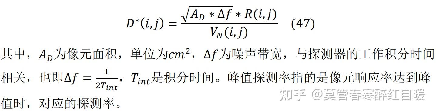 探测率是红外探测器单位面积单位噪声带宽下的信噪比,也即1W的辐射功率照射到面积为 1cm^{2} ,在 1Hz 的噪声带宽内获得的像元响应率 R(i,j) 与时域RMS噪声电压 V_{N}(i,j) 之比,单位为 cm\cdot\sqrt{Hz}\cdot W^{-1} ,其表达式为: