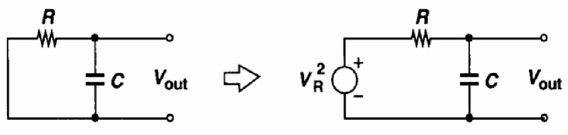 用一个串联电压 V_{R} 表示沟道电阻的噪声,通过该回路后得到输出的总噪声功率为: