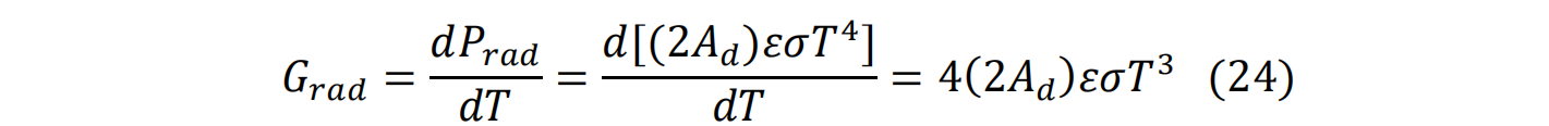 上式右边的第一项是探测器在偏置条件下所消耗的焦耳热,第二、第三项分别是探测器所吸收的来自被探测目标和衬底热沉的红外辐射,第四项为探测器通过热导G流向衬底热沉的热功率,最后一项是探测器向周围环境辐射出的红外辐射。当 dT\rightarrow0 时,探测器与周围环境之间辐射热导的表达式: