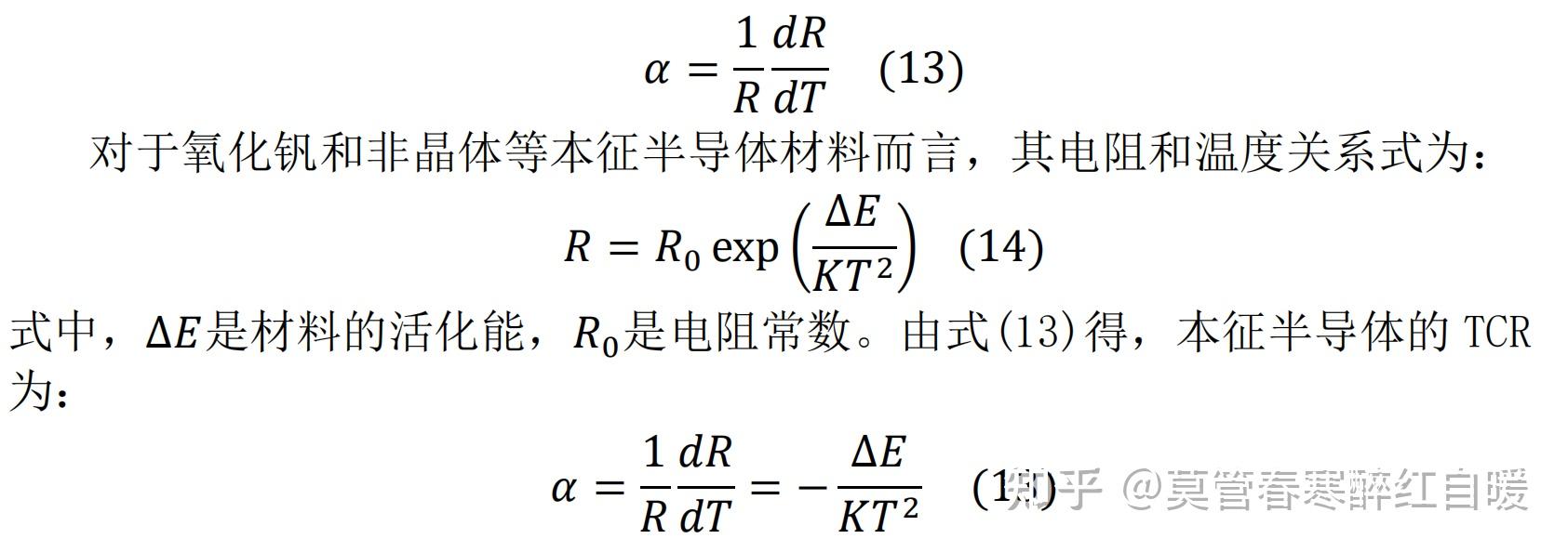 在众多的热敏半导体材料中,氧化钒和非晶硅因其出色的性能收到广泛应用。衡量热敏电阻材料的一个重要性质是电阻温度系数(TCR),定义为电阻随温度的相对变化率:
