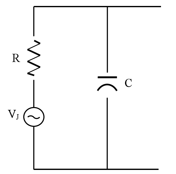 Johnson噪声是由载流子的随即热扰动引起的。任何一个两端开路的电阻,在其开路端都存在一个交变量噪声电压,这种噪声成为Johnson噪声,也称为热噪声。当频率 f\ll\frac{KT}{h} 时,单位频率带宽内的Johnson噪声电压和频率无关,是一种白噪声。微测辐射热计中热敏电阻在电路中的作用相当于一个噪声电阻和Johnson噪声电压串联,再和一个无噪声电容C并联[1]: