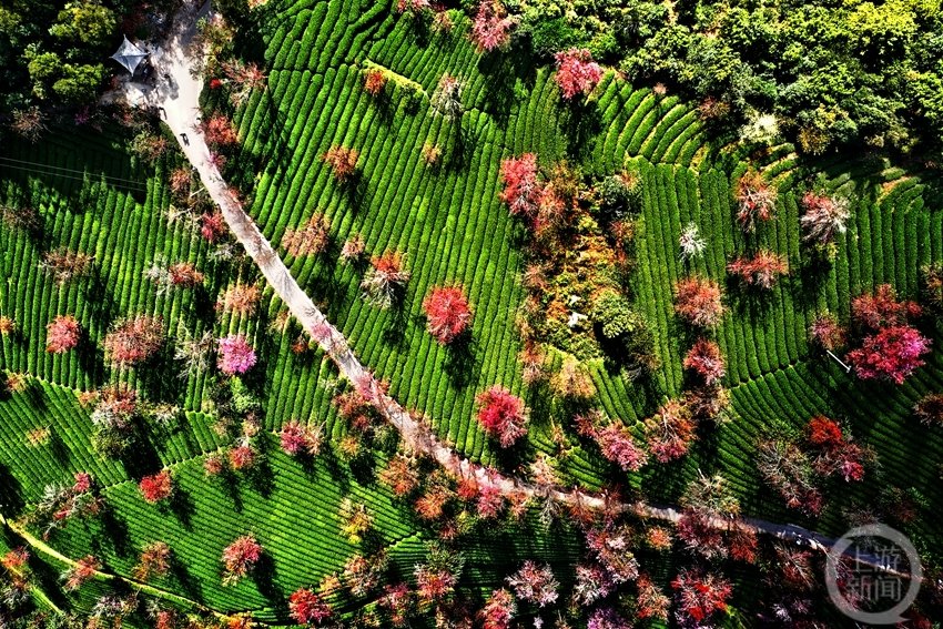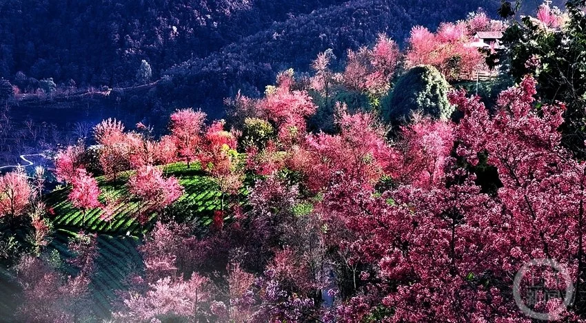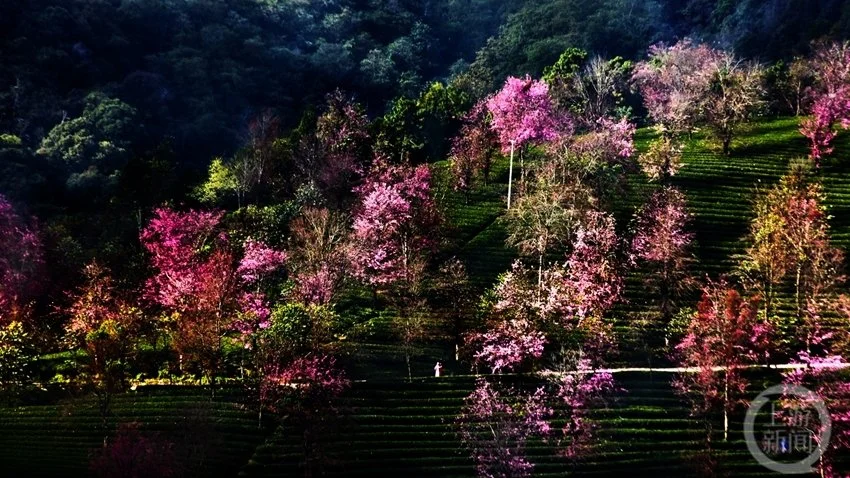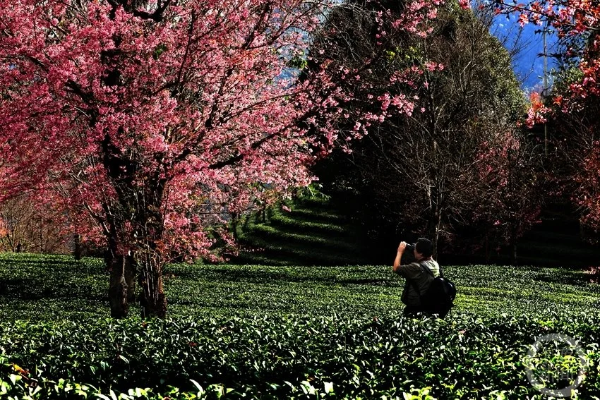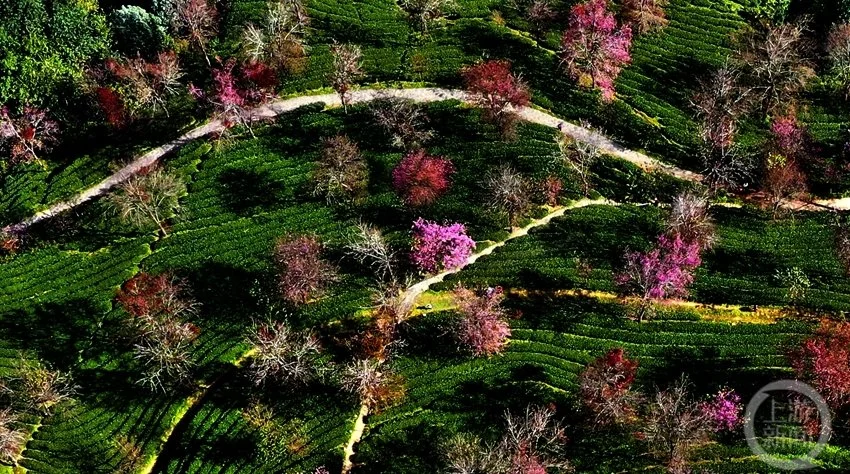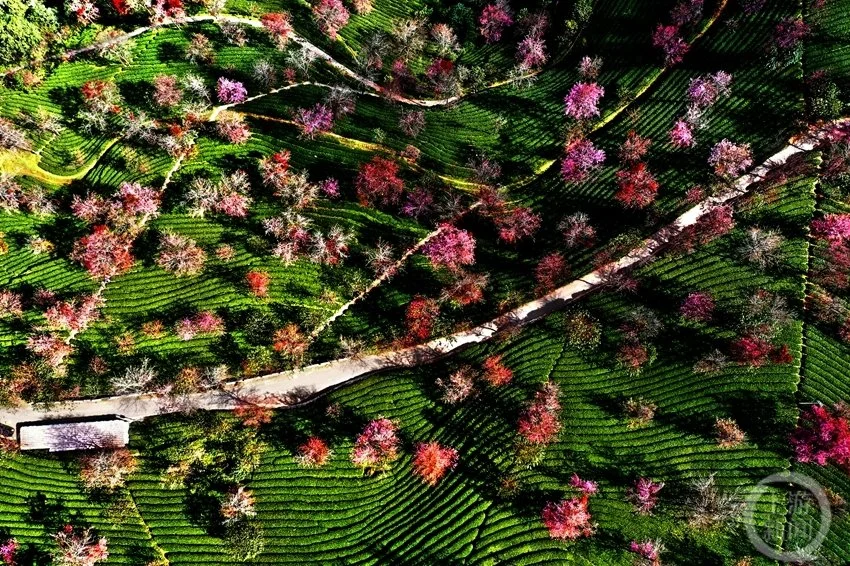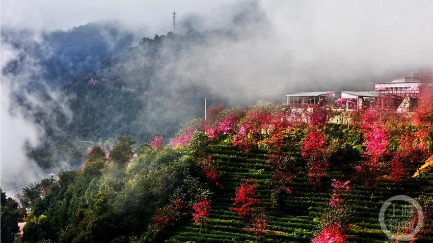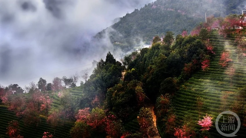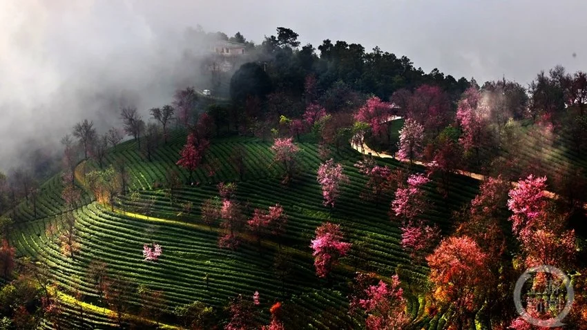每当花开时节,浓绿的茶带与绯红的樱花相互映衬,雾霾轻笼山涧,翠色簇拥茶田,繁花千树,红瘦肥绿的诗情画意在这里展现。
