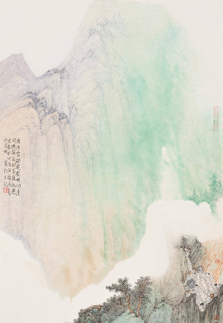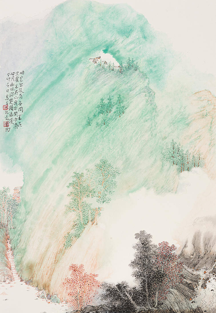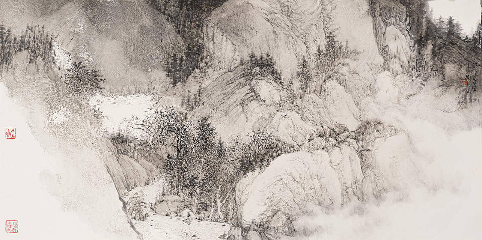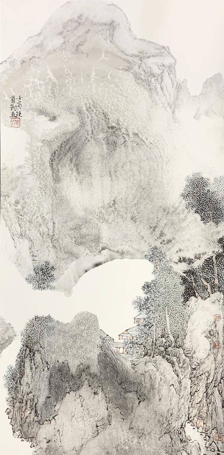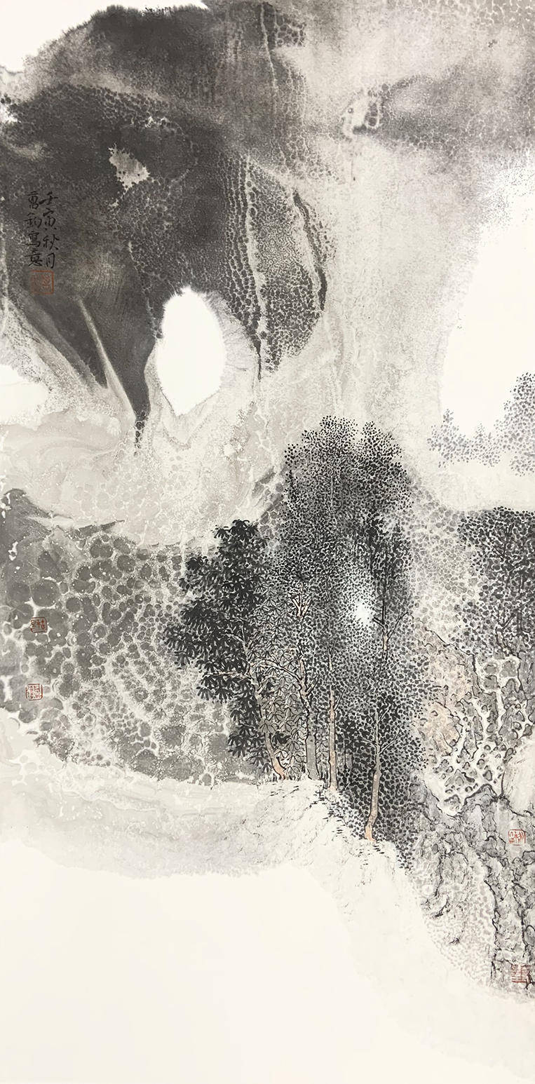 中国绘画讲究继承关系,只有好的继承才能有好的发展和创新,作为后学更要多学习前人的精髓来提升自我。通过对黄宾虹、张大千等人泼墨法的领悟学习,也有了点认识和体会,经过一段时间的创作实践对自己的创作也有了定位,在泼墨法的运用上感觉“黄氏”泼墨法对自己来说不够畅快;而“张氏”泼墨法又过于豪放,太过于依靠泼墨,用笔勾勒的太少,处理不好画面就会显得空或简单。对我而言无论是泼墨、泼彩都是为了解决之前画面的“紧”和“平”的问题,在泼的基础上通过丰富的笔墨来营造画面结构,加强画面的虚实、松紧关系。中国画还是要把用笔用墨这个基本问题弄明白,因为只有通过笔和墨才能体现出中国画的精神。为此,我在“黄氏泼墨法”和“张氏泼墨法”的基础上也做了一些新的探索和尝试,在艺术风格上慢慢的与前辈拉开距离,找到适合表达自己心性的笔墨语言和绘画风格。