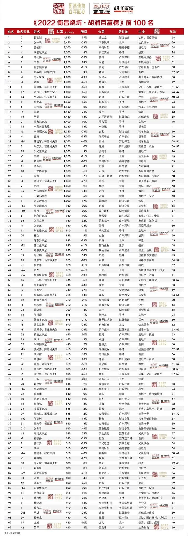 榜单显示,字节跳动39岁的张一鸣财富比去年下降950亿元,即28%,以2450亿元位列第二,排名不变。宁德时代54岁的曾毓群财富比去年下降900亿元,即28%,以2,300亿元位列第三,排名不变。