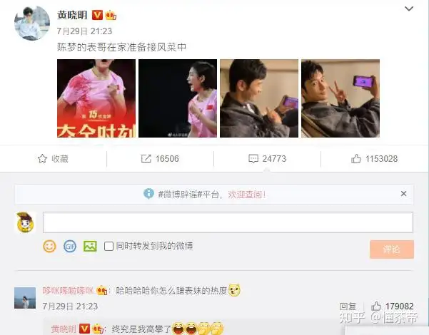 陈梦拿到奥运会冠军后,黄晓明也第一时间发微博称,“陈梦的表哥在家准备接风菜中。”