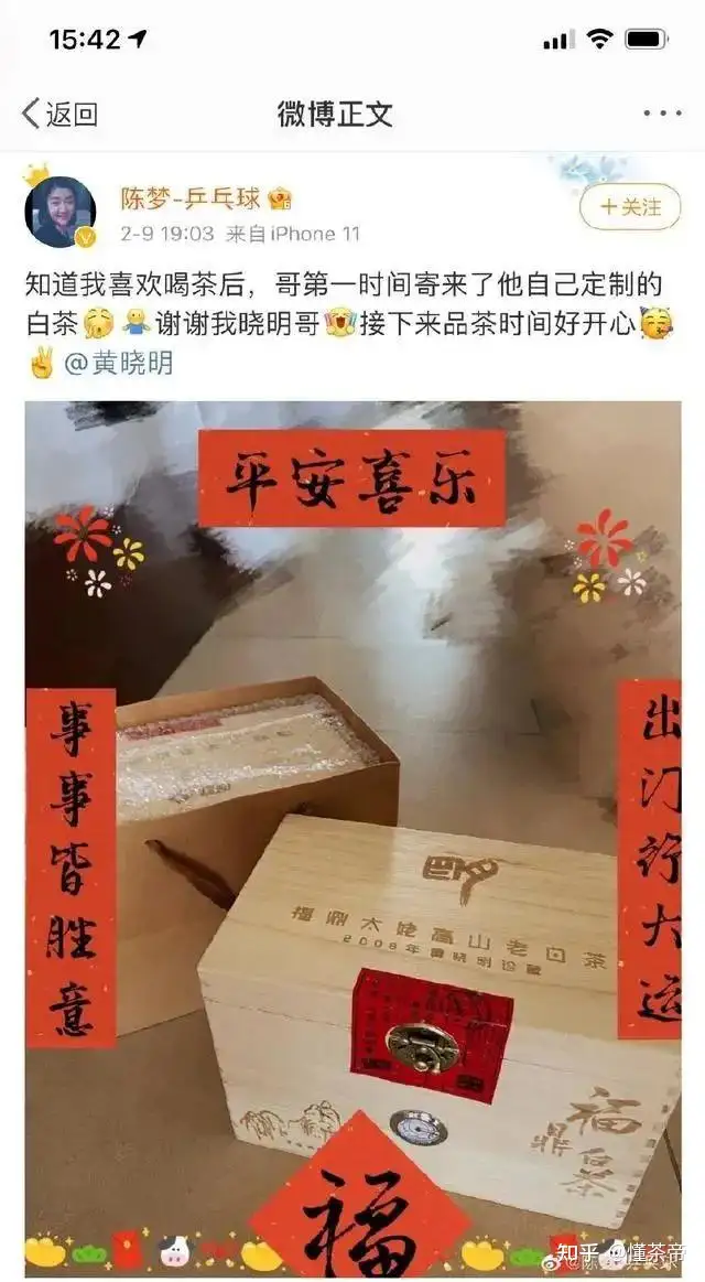 巧的是,黄晓明知道陈梦喜欢喝茶后,特意赠送她定制的老白茶,上面写着“福鼎太姥高山老白茶”。
