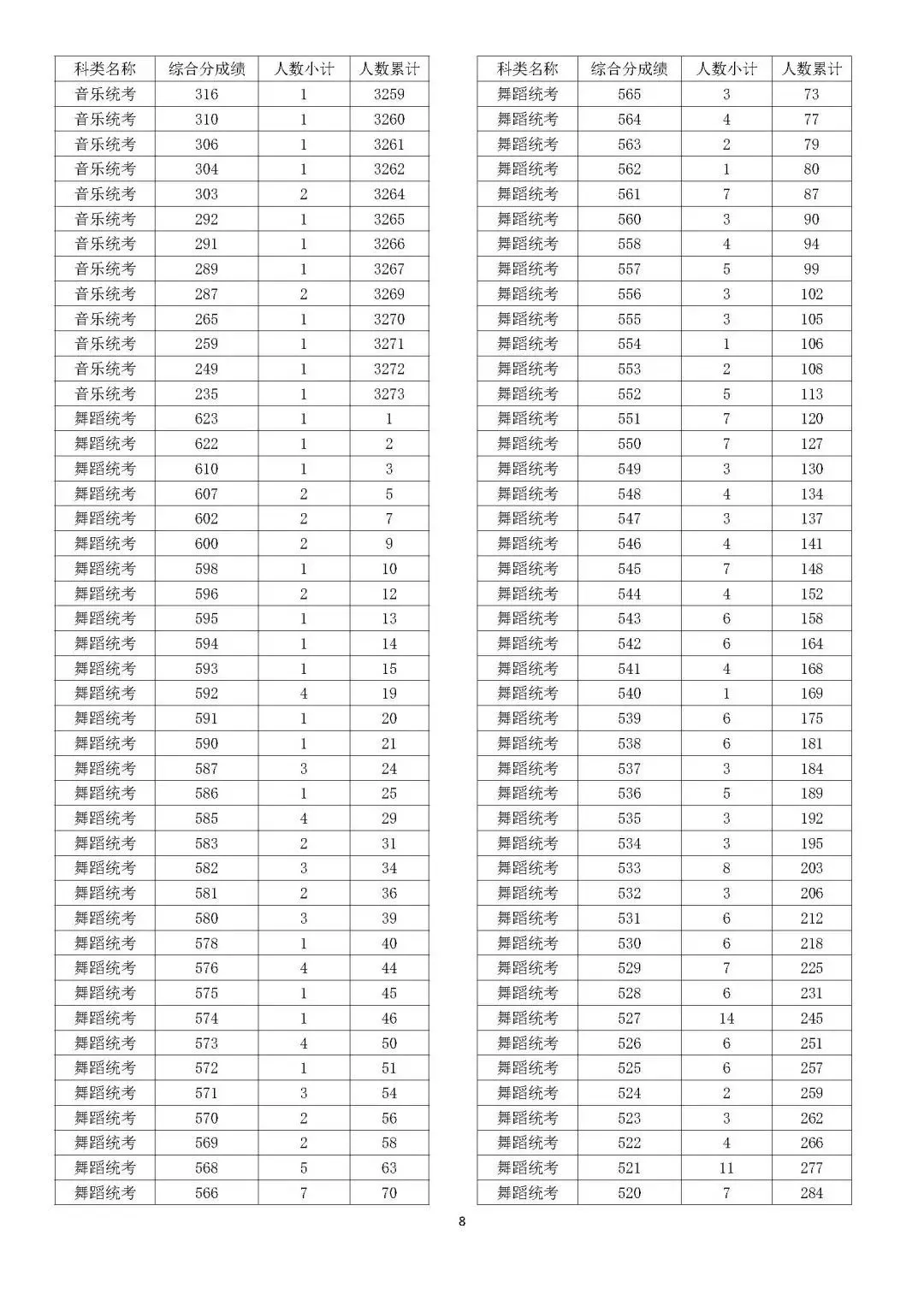 艺术类考生位次分类别按综合成绩确定。综合成绩相同时,按专业省统考成绩、高考总分、文化总分、语文数学总分、语文或数学单科成绩、外语单科成绩、选考科目单科成绩高低排序,全部相同者为同位次。