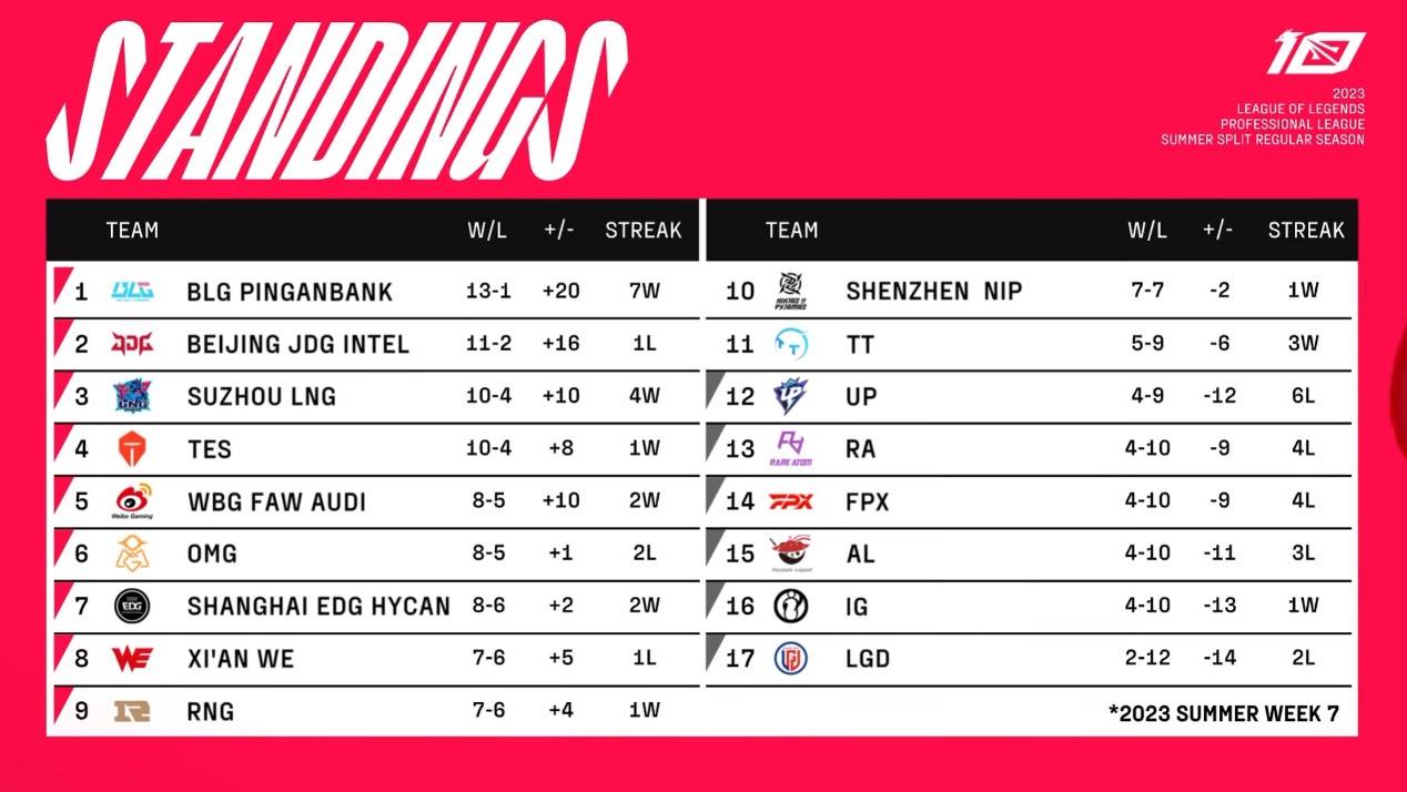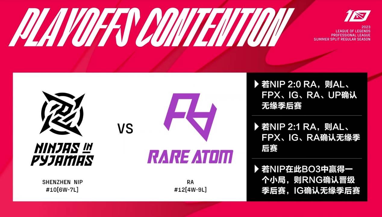 本轮NIP对阵RA的比赛,决定多支战队命运,LPL赛前也进行了解释,如果NIP能够横扫RA的话,AL,FPX,IG,RA和UP五支战队都将会被淘汰,无缘季后赛。