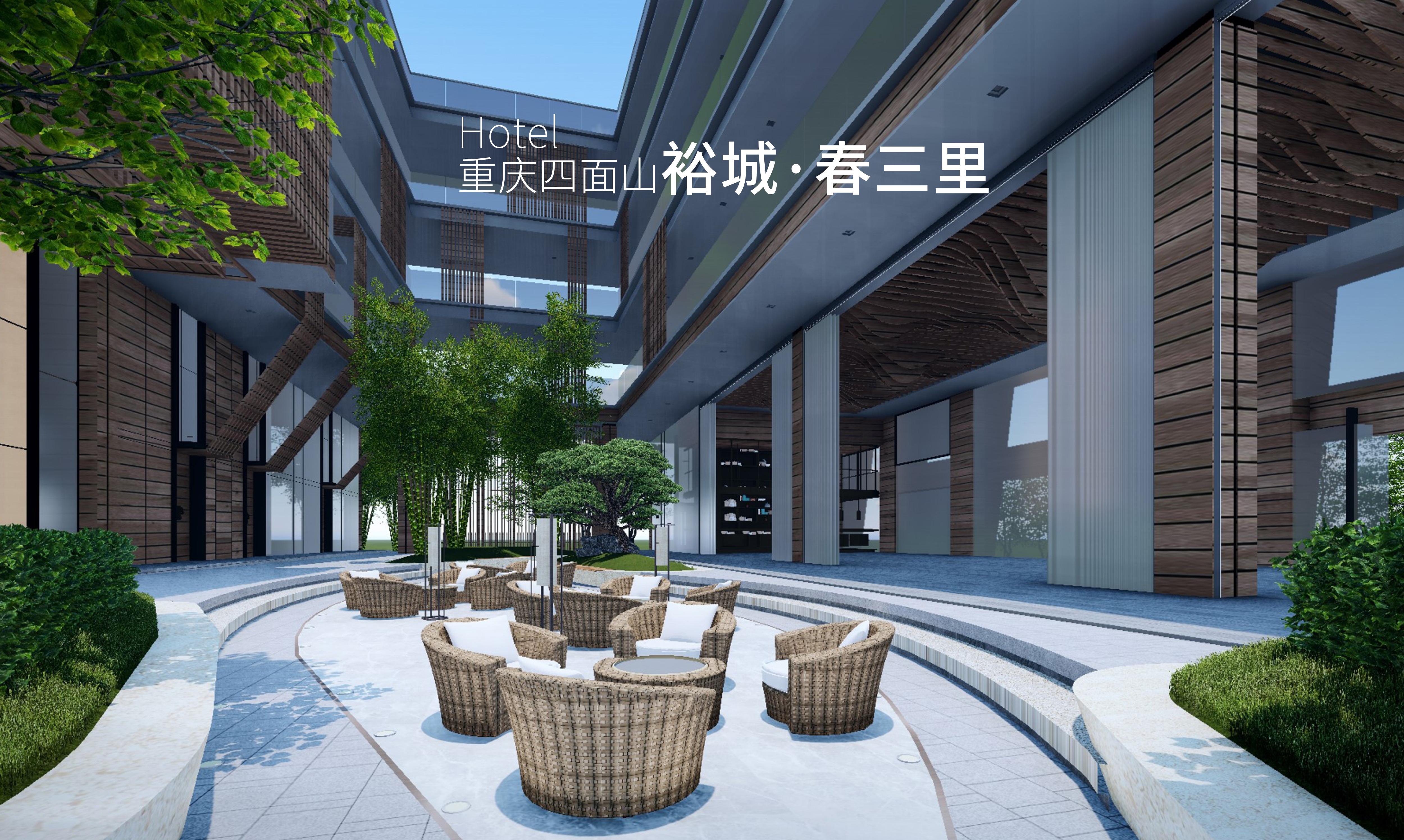 酒店布局依山就势,融古雅、简洁为一体,传达了“园中隐园,院融景园”的山地院落景观特质。通过文化元素的提取,形成人文环境的营造以及绿化空间的植入等多元素的交织和介入,打造出酒店的特色和亮点,实现绿色人文自然的景观环境,打造重庆最具代表性的文旅酒店群。