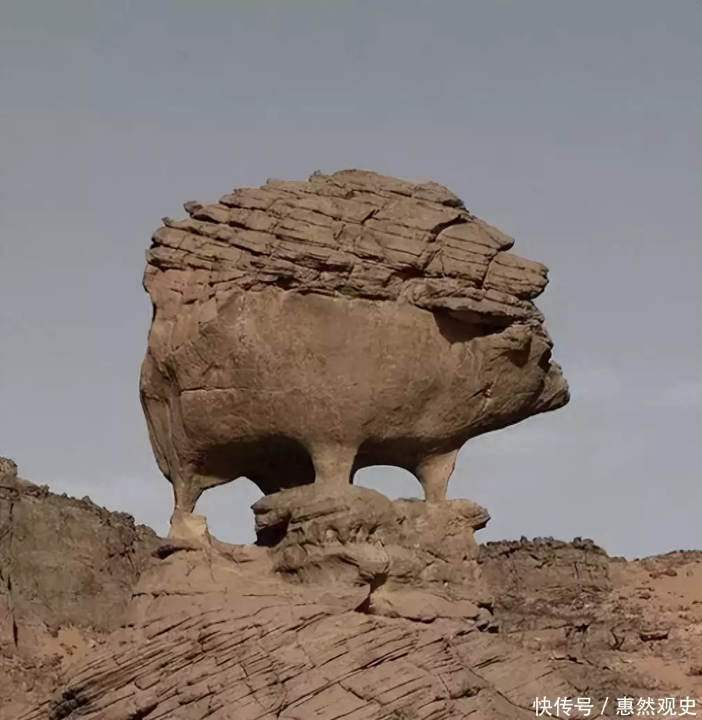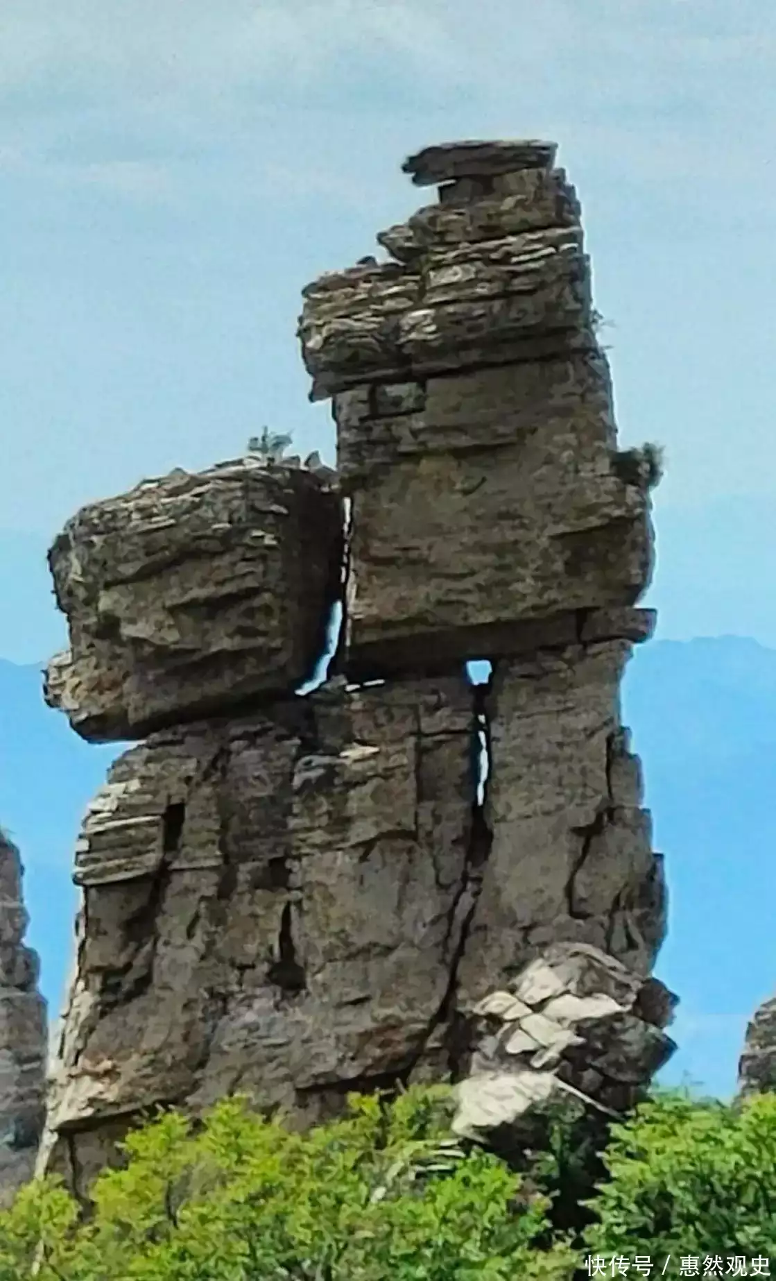 两层岩石形成鲜明的对比,就像是一个三角锥顶着一块200吨的重物,在力学上面达到了一种美妙的平衡。除了这些叫的上名的奇石,网上还有一些外貌同样生动的奇石景观。