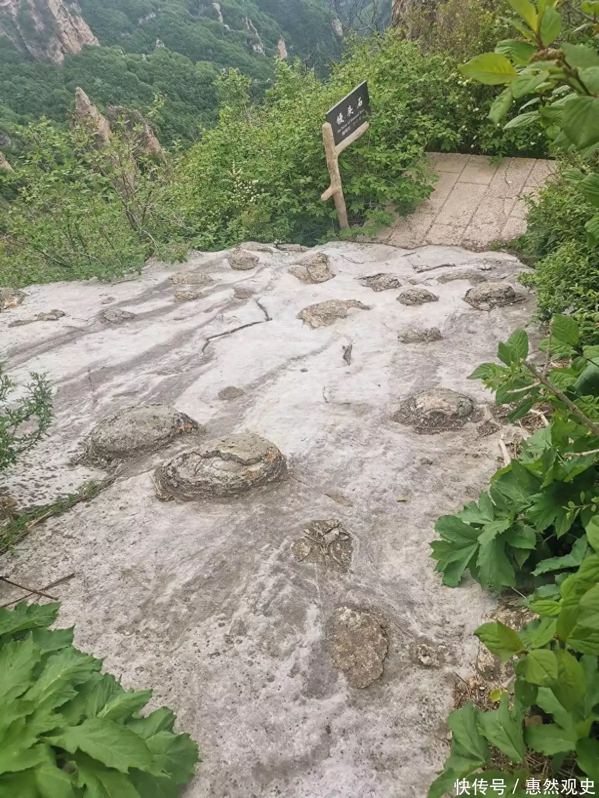馒头石位于山坡一次平坦的山壁上,然而却有一个个大小不一的凸起,就像是蒸笼内一个个排列的馒头,十分形象。有人更是觉得馒头石像是恐龙蛋,因此也叫恐龙石。