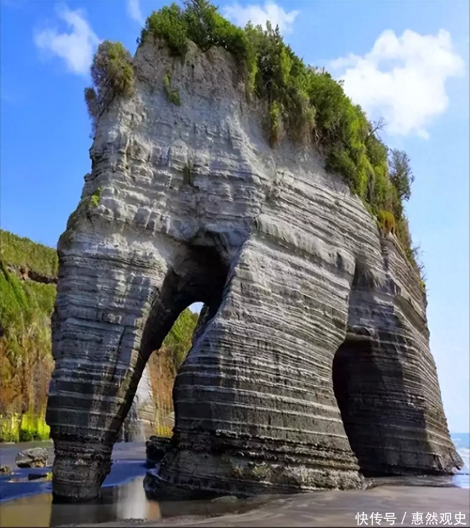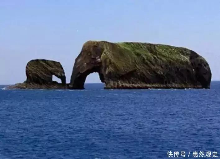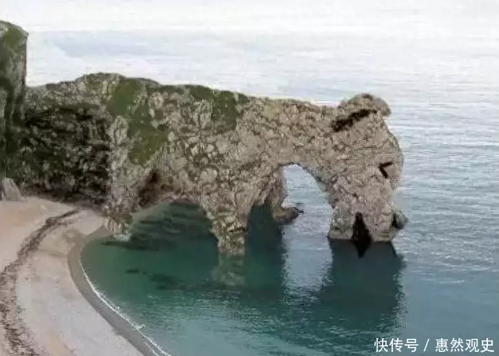 比如这座像是大象吸水一样的山石,长长的鼻子触及海滩,就像是口渴的大象来到海边喝水。从天空中看去,你会发现大象似乎扭着头。